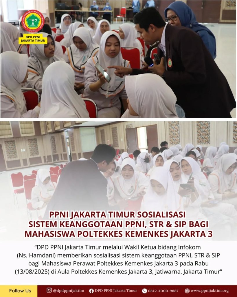 DPD PPNI Jakarta Timur melalui Wakil Ketua Bidang Infokom, Ns. Hamdani, melakukan sosialisasi mengenai Sistem Keanggotaan PPNI, STR, dan SIP bagi mahasiswa lulusan baru dari Poltekkes Kemenkes Jakarta 3. Kegiatan ini berlangsung di kampus Poltekkes Jakarta 3, Jatiwarna, Jakarta Timur, pada Rabu, 13 Agustus 2025.