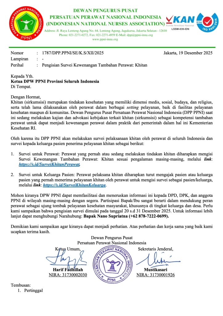 Berdasarkan Surat Edaran DPP PPNI Nomor 1787/DPP.PPNI/SE/K.S/XII/2025 tertanggal 19 Desember 2025, Dewan Pengurus Pusat Persatuan Perawat Nasional Indonesia (DPP PPNI) mengajak seluruh perawat untuk berpartisipasi dalam Survei Kewenangan Tambahan Perawat (Khitan).